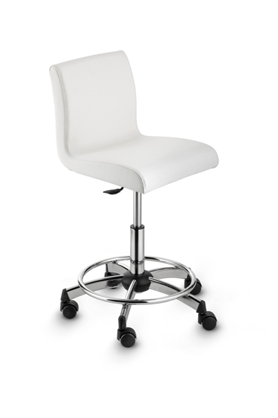 Низкий стул мастера. Стул оснащен алюминиевым основанием в форме пятилучья, колесами и газлифтом для регулировки высоты. Обивка - искусственная кожа высшего качества.