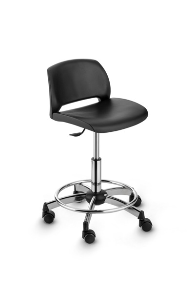 Низкий стул мастера. Стул оснащен алюминиевым основанием в форме пятилучья, колесами и газлифтом для регулировки высоты.