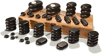 Набор базальтовых камней: 4- очень больших овальных плоских, 6-больших овальных плоских, 26-средних овальных плоских, 6-малых овальных плоских, 6-малых круглых для лица, 4-малых для точечного массажа, 2-белых мраморных овальных.