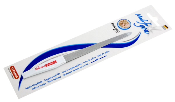 Пилка 17,5 см для ногтей с микросапфировым напылением. Одна сторона покрыта более крупным абразивом для грубой обработки ногтя, вторая с более мелким для финишной обработки.