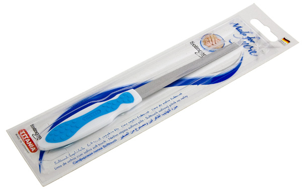 Пилка 20 см алмазная из хромированной пружинной стали, с нескользящей рукояткой эгрономичной формы, с микросапфировым напылением. Две степени зернистости - мелкая и крупная - обеспечивают обработку ногтей щадящим образом, предотвращая сколы и расслоение ногтей.