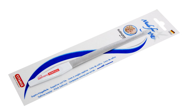 Пилка 20 см вогнутая с микросапфирным напылением и пластиковой ручкой, снабжённой сдвигателем кожи. Для удобства использования пилочка имеет две рабочие поверхности с крупным и мелким напылением.