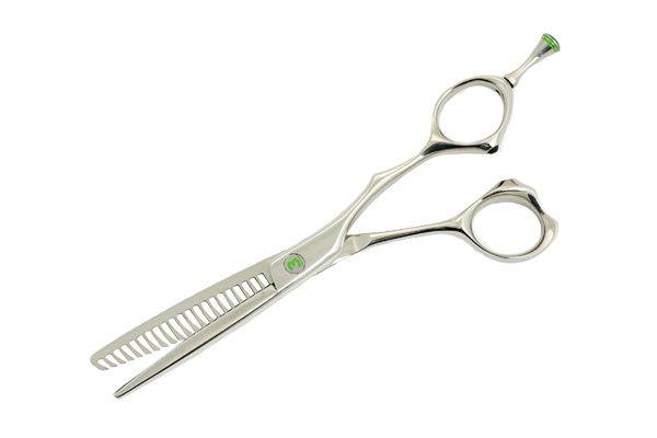Продуманный и выверенный эргономичный дизайн колец и ручек, гармонично сочетается с аккуратными режущими полотнами. Одно из полотен оснащено 21 филировочным зубчиком особой формы и с особой заточкой. Оригинальная "лесенка" из шести ступенек, нанесённая на режущую часть каждого зубца позволяет выполнять мягкую филировку и контролировать объём.