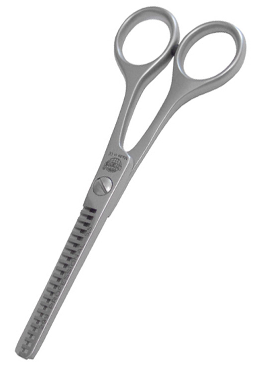 Ножницы филировочные (20 зубцов) Professional 5,5" классической формы с двухсторонней филировкой. Цельнометаллические ножницы из итальянской стали имеют ограничитель и усилитель хода, регулируемый винт и сменные кольца (регуляторы размера из мягкого пластичного материала), что делает наиболее удобным использование ножниц и предотвращают возможность аллергии.