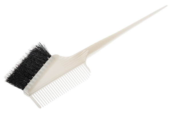 Профессиональная кисть с расчёской для окрашивания волос. Щетина кисти составлена из двух видов нейлоновых волокон. Внутренний ряд - мягкая, тонкая щетина для глубокого прокрашивания. Внешняя щетина - более жёсткая и волнистая - для оновного нанесения красителя.