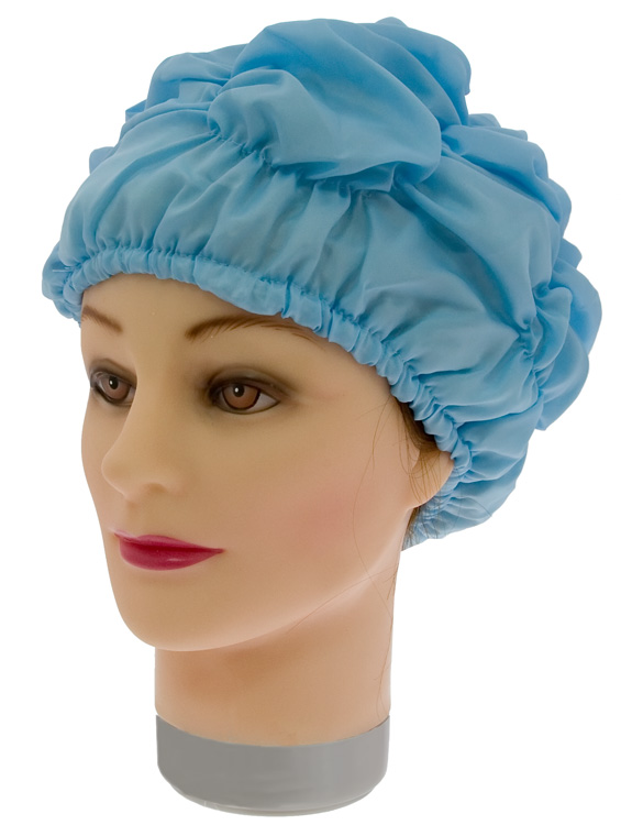 Пластиковая шапочка голубая для душа с широкой эластичной лентой.