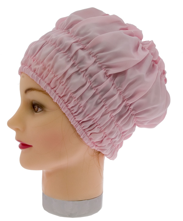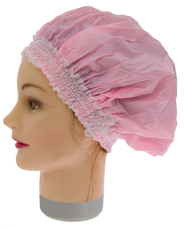Пластиковая шапочка розовая для душа с широкой эластичной лентой.