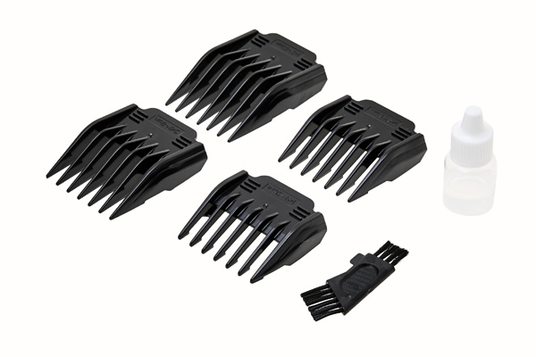 Комплектация: база для зарядки, 4 насадки, сетевой адаптер, щетка для чистки, смазочное масло для ухода за ножевым блоком.