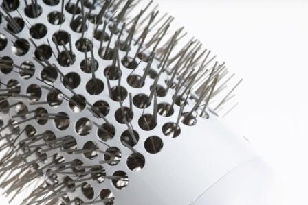 Термобрашинг 44 мм с турмалиновым покрытием и щетиной из термостойкого нейлона. Частицы турмалина ухаживают за волосами в процессе укладки, а силиконовая ручка термобрашинга не позволяет соскальзывать руке мастера во время работы.