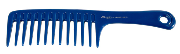 Расческа с ручкой синяя с редкими зубьями.