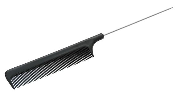 Расческа пластиковая, чёрная с тонкой длинной металлической ручкой хвостик. Это основная рабочая расческа. Ею удобно отделять пряди волос и делать начес при укладке, так как ее зубцы имеют неодинаковую длину.