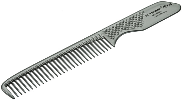 Расчёска рабочая антистатичная цвета металлик с удобной ручкой для стрижки под машинку.