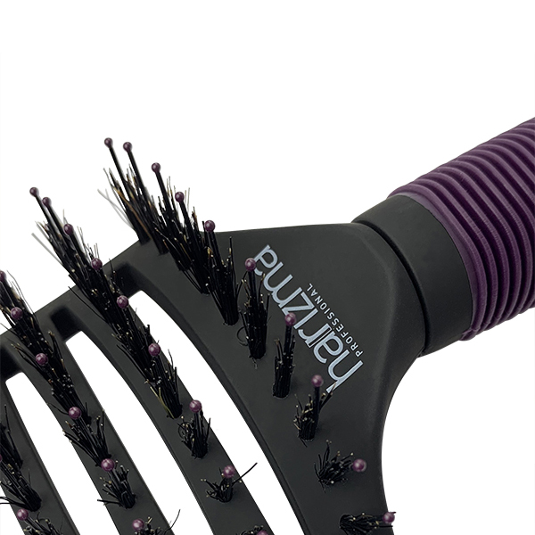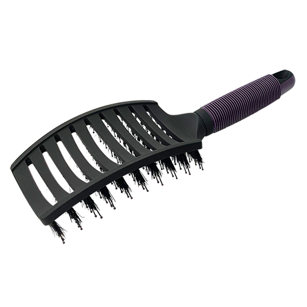 Продувная щётка для волос оригинальной вогнутой формы с комбинированной щетиной. Сочетание штырьков из нейлона с натуральной щетиной позволяет более надежно захватывать и фиксировать пряди во время укладки. Большие продувные отверстия в корпусе щетки позволяют теплому воздуху обдувать прядь со всех сторон одновременно что значительно ускоряет процесс сушки и укладки.