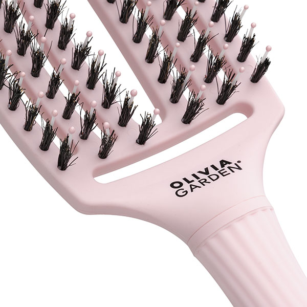 Fingerbrush Care Iconic Boar&Nylon Pastel Pink - щетка для волос с натуральной щетиной и ионизированными нейлоновыми щетинками с шариковыми наконечниками, которые делают волосы более блестящими, гладкими и шелковистыми. Кроме того, внешняя поверхность щётки имеет изогнутый дизайн, повторяющий форму головы. Это позволяет создавать больший объём от корня, лучше контролировать натяжение локона при укладке и создавать великолепные причёски.