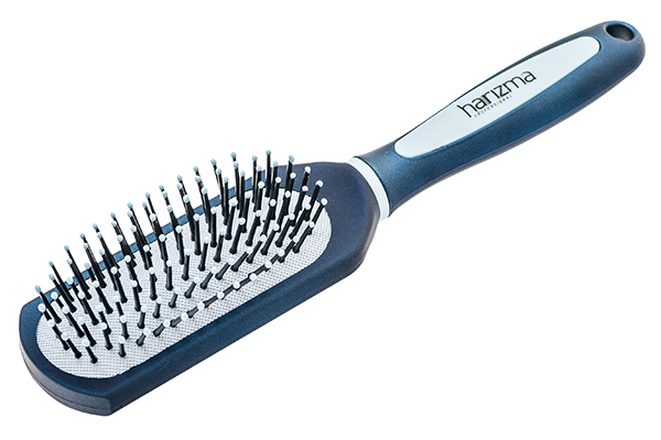 Профессиональная массажная щётка для волос harizma. Овальная мягкая подушка с 7 рядами штырьков из термостойкого нейлона с шариковыми наконечниками. Комфортная ручка с покрытием Soft Touch.