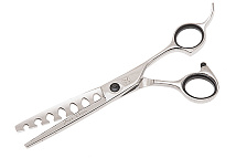 У филировочных ножниц Art Thin 6.0" всего 7 зубцов, однако заточка конвекционная, поэтому использовать их можно и для креативных стрижек, и для скользящего среза. Специальная винтовая система позволяет за секунды отрегулировать натяжение режущих полотен, а благодаря микроподшипнику ход полотен мягкий и нет люфта.